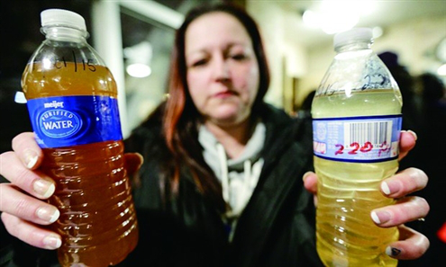 弗林特水危機(jī)期間一名市民展示受?chē)?yán)重污染的飲用水