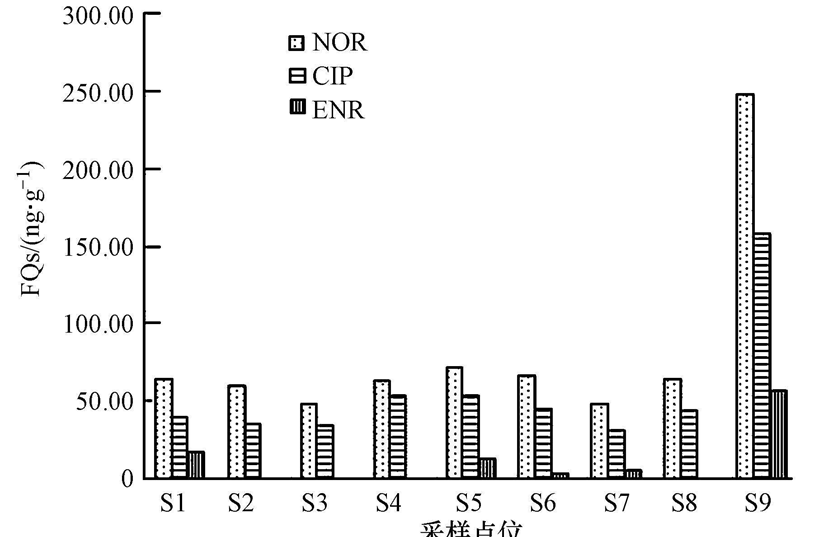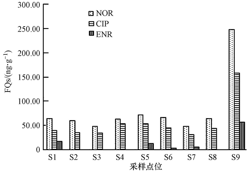從圖 1可見(jiàn),9個(gè)采樣點(diǎn)均可檢測(cè)到NOR和CIP,S2、S3、S4、S8均未檢測(cè)到ENR.各樣點(diǎn)FQs含量均為NOR>CIP>ENR.S9的FQs含量最高,NOR含量最高為248.25 ng · g-1,CIP最高為158.69 ng · g-1,ENR最高為56.81 ng · g-1.
