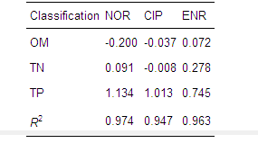 對(duì)NOR、CIP及NOR含量與OM、TN、TP進(jìn)行多元線性回歸分析(見(jiàn)表 2),sig均小于0.001,R2在0.947~0.974間,回歸方程有效,回歸模型與實(shí)驗(yàn)得到的數(shù)據(jù)均吻合較好.從多元回歸分析中得出NOR、CIP及NOR含量主要取決于TP的含量(表 2).