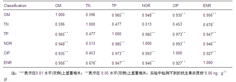 本研究中(表 1和表 2),3種FQs與OM、TP間呈極顯著正相關(guān).S9點(diǎn)位OM含量最高,沉積物中的OM蘊(yùn)含物質(zhì)復(fù)雜多元,F(xiàn)Qs進(jìn)入水體后會(huì)迅速被吸附,因此S9點(diǎn)位測(cè)得的3種FQs也最高,這與張勁強(qiáng)等的研究也相符合.Carrasquillo認(rèn)為FQs有很強(qiáng)烈的吸附固相,能夠強(qiáng)烈吸附在顆粒物和沉積物中(Carrasquillo et al., 2008),可見(jiàn)FQs與沉積物間的相互吸附作用強(qiáng)烈,也可以解釋FQs在沉積物中含量高的原因.