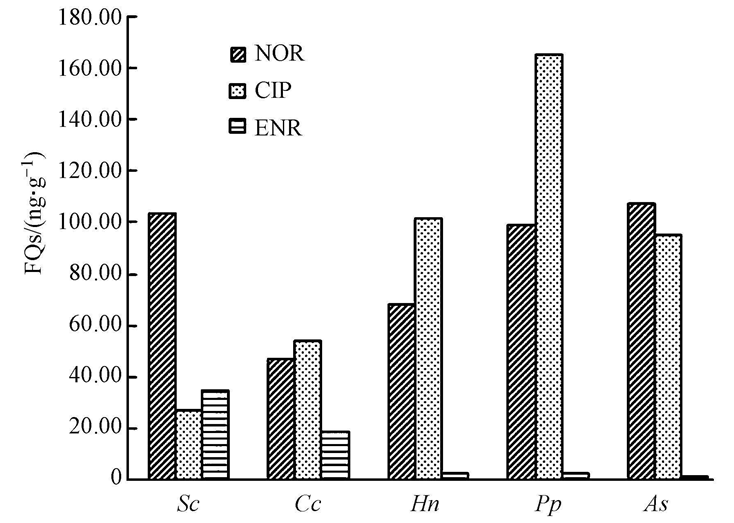 從圖 3可見(jiàn),5種魚(yú)肉中均檢測(cè)出了NOR、CIP、ENR的存在.Cc、Hn和Pp魚(yú)肉中檢測(cè)到CIP>NOR>ENR,As、Sc魚(yú)肉中檢測(cè)到NOR>CIP>ENR,5種魚(yú)肉中ENR的含量相對(duì)低于NOR及CIP的含量.As魚(yú)肉中NOR含量最高為106.85 ng · g-1,Pp魚(yú)肉CIP含量最高為165.15 ng · g-1.