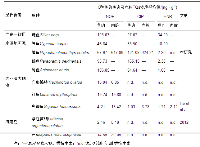 本研究測(cè)得5種魚(yú)的魚(yú)肉中的FQs含量均顯著高于大亞灣大鵬澳和海陵島中魚(yú)的FQs的含量;部分魚(yú)類魚(yú)肉和內(nèi)臟中NOR、CIP含量高于美國(guó)、歐盟的許多國(guó)家的殘留標(biāo)準(zhǔn)(殘留限量為30 ng · g-1),也高于我國(guó)農(nóng)業(yè)部標(biāo)準(zhǔn)NY 5070—2001《無(wú)公害食品水產(chǎn)品中漁藥殘留限量》的殘留標(biāo)準(zhǔn)(NOR、CIP殘留限量為50 ng · g-1).分析原因乃為同上,主要是養(yǎng)殖魚(yú)塘、禽畜養(yǎng)殖業(yè)、城鎮(zhèn)生活污水及感潮河流的滯留效應(yīng),導(dǎo)致面源污染嚴(yán)重,水體中可能含有較高的FQs含量.Li的研究表明FQs在可食用的軟體動(dòng)物內(nèi)臟中性質(zhì)穩(wěn)定(Li et al., 2012);孫言春的研究也表明FQs在魚(yú)體內(nèi)吸收較快,消除較慢,F(xiàn)Qs在魚(yú)體內(nèi)富集作用較強(qiáng).魚(yú)內(nèi)臟部位為代謝器官,因此,更易積累,造成魚(yú)內(nèi)臟中抗生素含量較高的現(xiàn)象.魚(yú)體內(nèi)臟中FQs含量多數(shù)情況下高于魚(yú)肉中FQs含量,這個(gè)結(jié)果與He的研究結(jié)果一致.