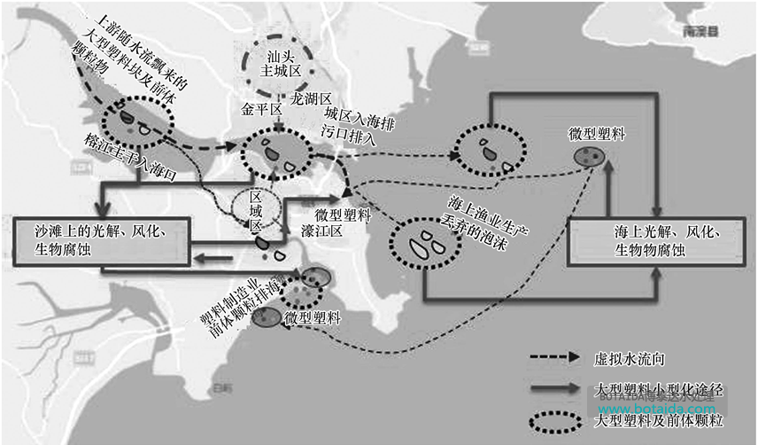 1)大型塑料和前體顆粒物的來源有:榕江上游隨水流飄入的部分,沿岸城區(qū)排放入海的部分,以及周圍塑料加工業(yè)排入環(huán)境中的前體顆粒.