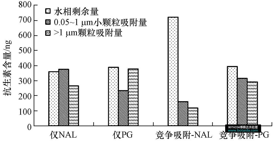 圖 1所示為萘啶酸(NAL)與青霉素G(PG)單獨存在及共同存在于水中的吸附實驗結(jié)果.通過對比水相剩余量可知,當萘啶酸和青霉素G同時存在時,固體顆粒對青霉素G的吸附能力大于對萘啶酸的吸附能力.與抗生素單獨存在相比,萘啶酸的水相剩余量顯著增大,而青霉素G的水相剩余量則基本維持不變.可見,青霉素G的存在很大程度地抑制了顆粒對萘啶酸的吸附,但顆粒對其自身的吸附量影響甚微.這同時說明單一物質(zhì)存在時,即使吸附達到平衡,顆粒上的吸附位點卻未飽和,顆粒的吸附能力并未達到最大.