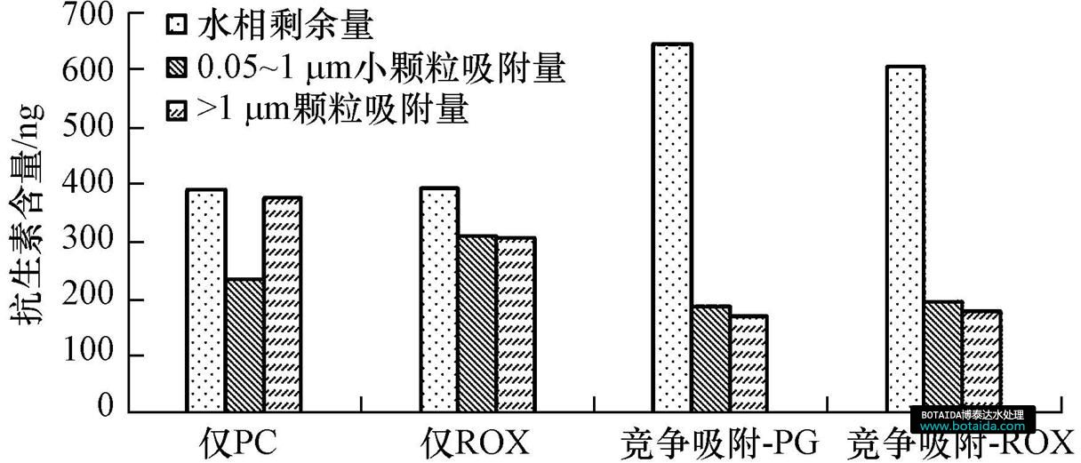 圖 6所示為青霉素G(PG)與羅紅霉素(ROX)單獨存在及共同存在于水中的吸附實驗結(jié)果.顆粒上的吸附總量有一定增加,增幅在所有6種競爭吸附中最小,這說明二者同時投加時相互抑制的現(xiàn)象比較明顯.具體到小顆粒的吸附能力及吸附量,二者降幅明顯且羅紅霉素降幅更大,競爭吸附平衡后二者吸附量相當.小顆粒吸附總量由309.20 ng上升至379.48 ng,漲幅為22.8%,依然存在吸附未達飽和的現(xiàn)象.結(jié)構(gòu)上看,二者的活性基團不同,不會造成吸附位點的競爭,而且相互之間不發(fā)生復合反應(yīng),不影響抗生素本身的組成,但可能由于羅紅霉素分子量較大,占用空間較大,因此,產(chǎn)生了二者顆粒上的吸附量均減少但總量增多的結(jié)果.