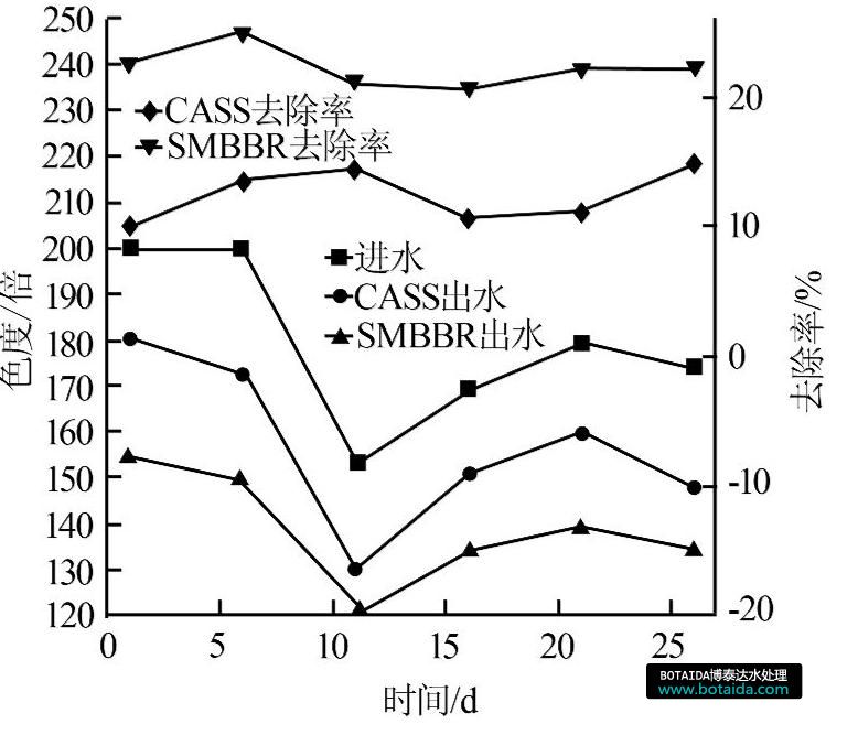 圖5 CASS和SMBBR工藝對(duì)色度的去除效果