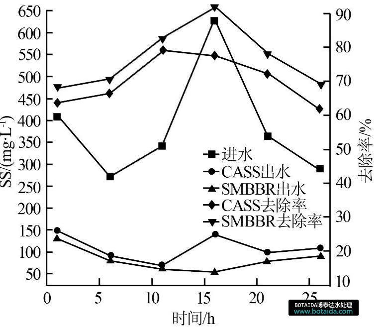 圖6 CASS和SMBBR工藝對(duì)SS的去除效果