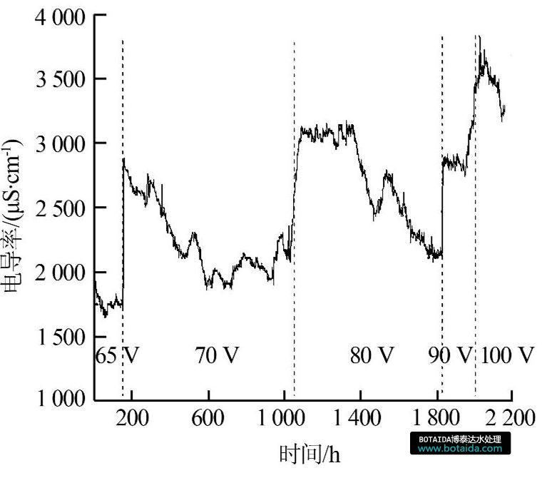 電滲析脫鹽是靠電能來遷移水中己解離的離子,因此運(yùn)行電壓和水中含鹽量成正比。從圖3可以看出,進(jìn)水電導(dǎo)率在1 800~3 800 μS/cm波動(dòng),在第182小時(shí)時(shí)進(jìn)水電導(dǎo)率突然從1 700 μS/cm升高至 2 800 μS/cm,最高電導(dǎo)率出現(xiàn)在運(yùn)行時(shí)間第2 052小時(shí),為3 750 μS/cm,因此需要根據(jù)進(jìn)水電導(dǎo)率的變化不斷調(diào)整運(yùn)行電壓。另一方面,隨著電滲析器的運(yùn)行,離子交換膜表面污染物逐漸累積,導(dǎo)致電阻增大,因此為保證脫鹽率以及產(chǎn)水水質(zhì),也需要逐步提升運(yùn)行電壓。因此,在整個(gè)試驗(yàn)期間,運(yùn)行電壓逐步從65 V調(diào)整至100 V,以保證產(chǎn)水水質(zhì)滿足循環(huán)水補(bǔ)水要求。