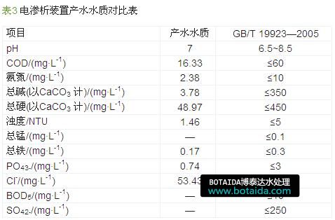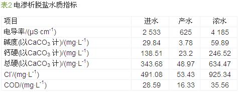 將電滲析裝置產(chǎn)水與《城市污水再生利用/工業(yè)用水水質(zhì)》(GB/T 19923—2005)中要求的標(biāo)準(zhǔn)進(jìn)行對(duì)比,結(jié)果見表3。