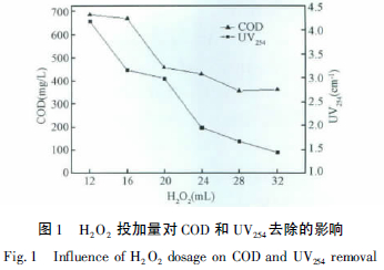 2.1 雙氧水的投加量對廢水COD 和UV254的影響