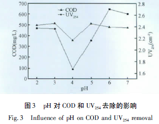 2.3 pH 對廢水COD 和UV254的影響