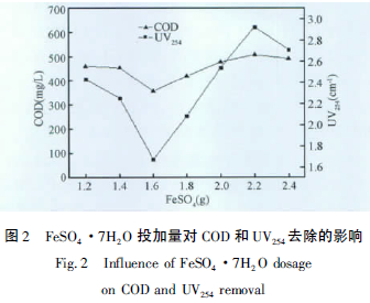 2.2 FeSO4 ·7H2O 的投加量對廢水COD 和UV254的影響