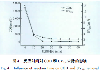 2.4 反應時間對廢水COD 和UV254的影響