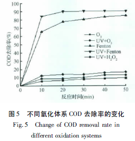量取300 mL 廢水,調節(jié)其pH=4 分別采用O3、UV/O3、Fenton(28 mL H2O2、1.6g FeSO4·7H2O) 、UV-Fenton(28 mL H2O2、1.6g FeSO4·7H2O) UV/H2O2(2 mL H2O2) 氧化體系處理廢水50 min,并分別在0、10、20、30、40 和50 min 取樣,中止反應,測定處理后廢水的COD,其COD 去除率隨時間的變化如圖5 所示。