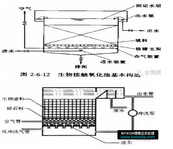 接觸生物法是一種兼有活性污泥法和生物膜法特點的一種新的污水生化處理方法。這種方法主要設(shè)備是生物接觸氧化濾池。在不透氣的曝氣池中裝有焦炭、礫石、塑料蜂窩等填料,填料被水侵沒,用鼓風(fēng)機在填料底部曝氣充氧。