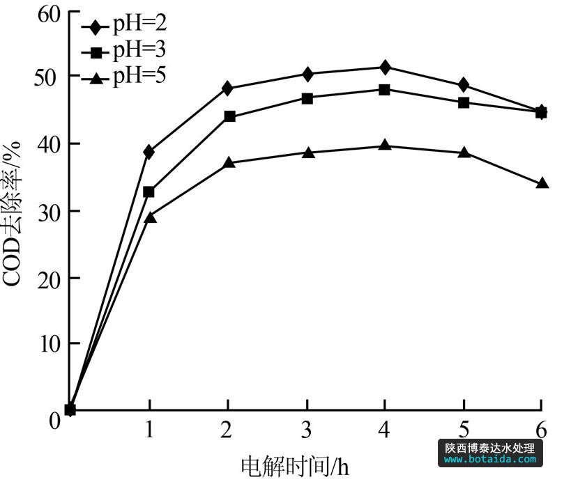 綜上不難發(fā)現(xiàn),當滲濾液的pH分別為2、3、5 時,隨電解時間的延長,COD去除率進一步增加,但超過4 h后去除率基本不變;當電解電壓為24、36 V,電解4 h時,COD去除率達到最大;極板間距為1.5 cm時,電解約4 h COD去除率也達到最大值。這說明采用Ir-Ta-Sn摻雜電極對垃圾滲濾液進行電催化降解時,電解時間不宜超過4 h,此時COD去除率已達到最大值;電解時間繼續(xù)延長,垃圾滲濾液中的COD不但不降低,反而會有一定程度的回升。因此合理控制電化學(xué)氧化時間,可以減少能耗,并提高COD去除率。