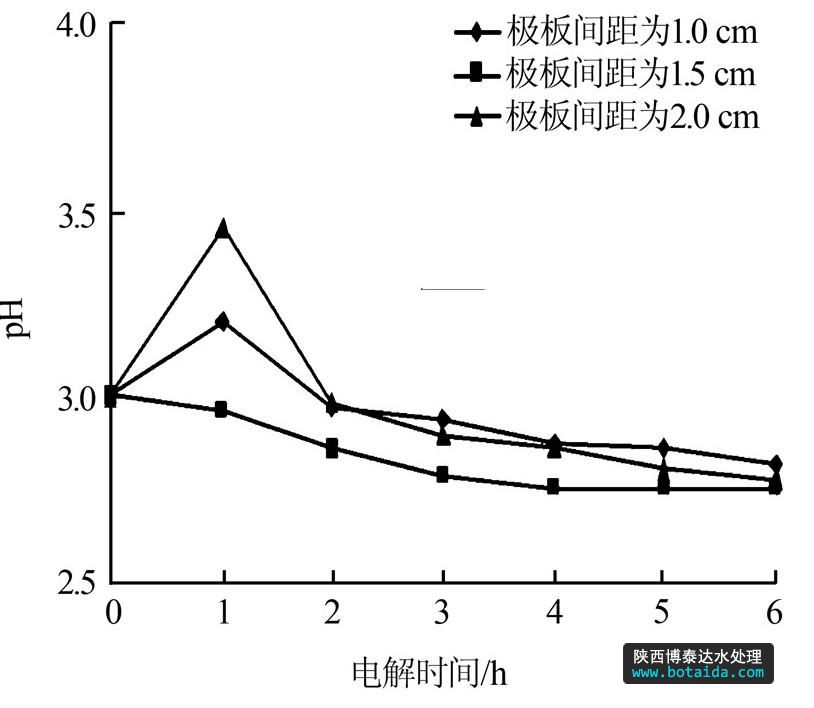 考慮到過高的電解電壓對電催化降解的影響不是很顯著,且由正交實驗結(jié)果可知,電解電壓為24 V、pH為3時COD去除率最高,因此調(diào)整電解電壓為24 V、垃圾滲濾液pH為3,分別設(shè)置極板間距為1.0、1.5、2.0 cm進行電催化降解實驗,每隔1 h取1次水樣,電解過程中COD去除率及pH變化情況如圖 5、圖 6所示。