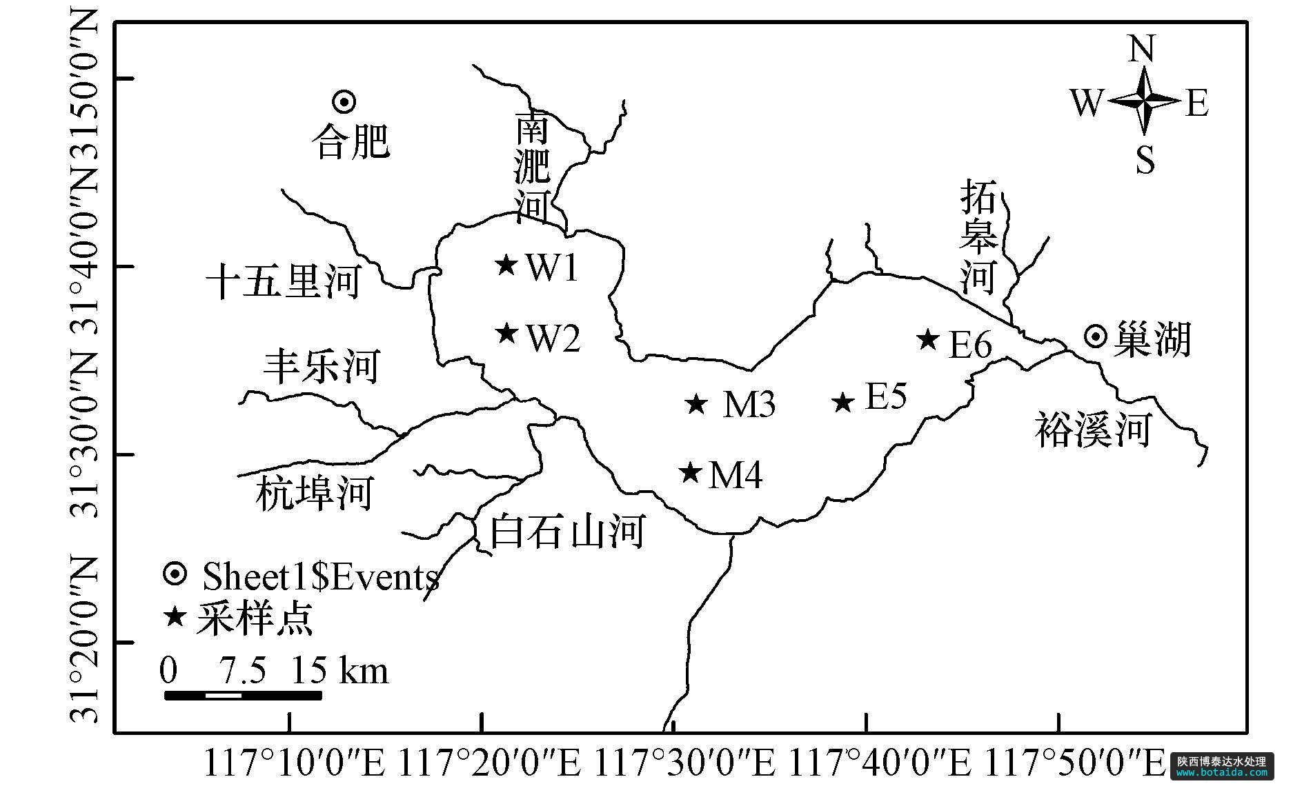 巢湖(31°25′~31°43′ N,117°16′~117°50′ E)位于安徽省中部,江淮丘陵之間,湖岸線總長184.7 km,東西長61.7 km,南北寬20.8 km,最大水深3.77 m,平均水深2.69 m,現(xiàn)有水域面積大約為770 km2,蓄水量20.7×108 m3(王蘇民等,1998).流域總面積達(dá)16659 km2,以巢湖與裕溪河之間的閘門分為兩個部分(余秀娟,2012),屬亞熱帶與暖溫帶過渡性的副熱帶季風(fēng)氣候區(qū),氣候溫和濕潤,年平均溫度在15~16 ℃之間,多年平均降水量為1000~1158 mm.流域內(nèi)地形地貌西高東低、中間低洼平坦(顧成軍等,2005).流域內(nèi)共有河流33條,分別屬于南淝河-店埠河、杭埠河-豐樂河、白石山河、柘皋河、派河、裕溪河等7條水系,從南、西、北呈放射狀直接或間接匯入巢湖,再由裕溪河注入長江(高超等,2009).1962年建成巢湖閘控制水位后,基本上切斷了巢湖與長江在自然狀態(tài)下的水量交換,巢湖由自然狀態(tài)下的過流性湖泊,成為半吞吐型過水湖泊.由于入湖河流上游坡陡流急,挾帶大量泥沙匯入湖內(nèi)沉積,多年來,巢湖因流域河流輸沙影響而導(dǎo)致淤積嚴(yán)重(閻伍玖等,1998).