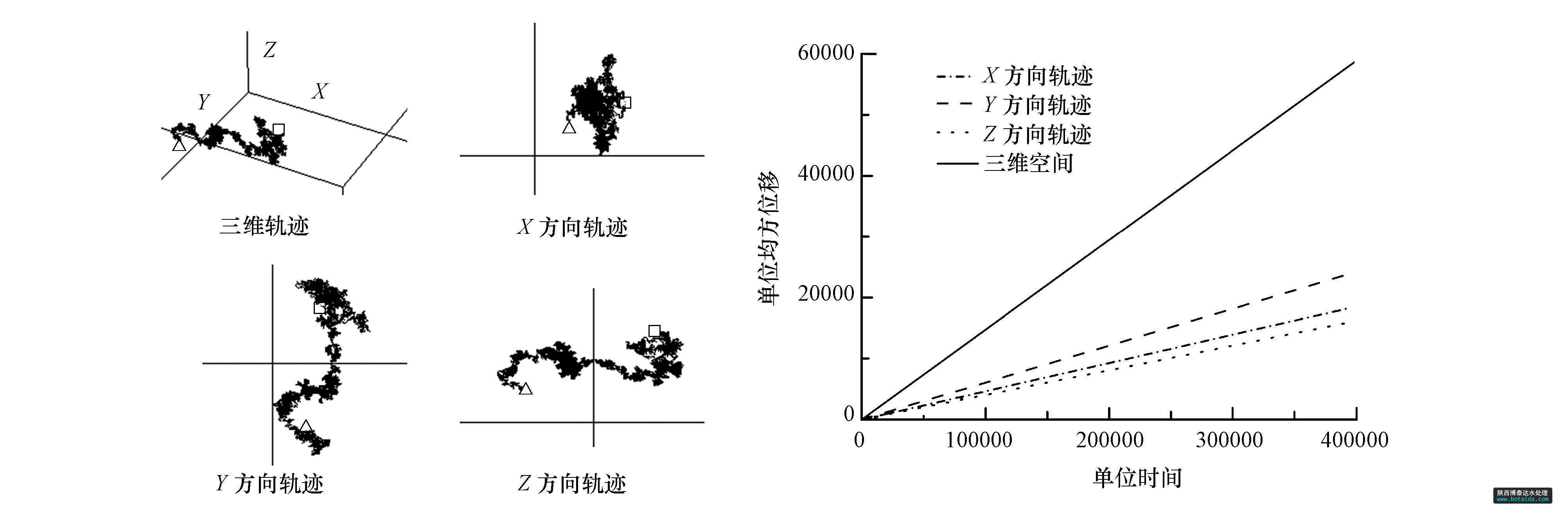 根據(jù)以上結(jié)果,利用Rwalk程序?qū)αW釉谧杂煽臻g與沉積物孔隙中的擴(kuò)散進(jìn)行隨機(jī)行走模擬,結(jié)果見圖 3(以W1點1~2 cm深度內(nèi)樣品為例),其中,空心方框和三角分別表示行走軌跡的起點和終點.由于沉積物結(jié)構(gòu)的各向異性,根據(jù)不同方向的均方位移與時間統(tǒng)計結(jié)果可以得到不同方向的曲率值.