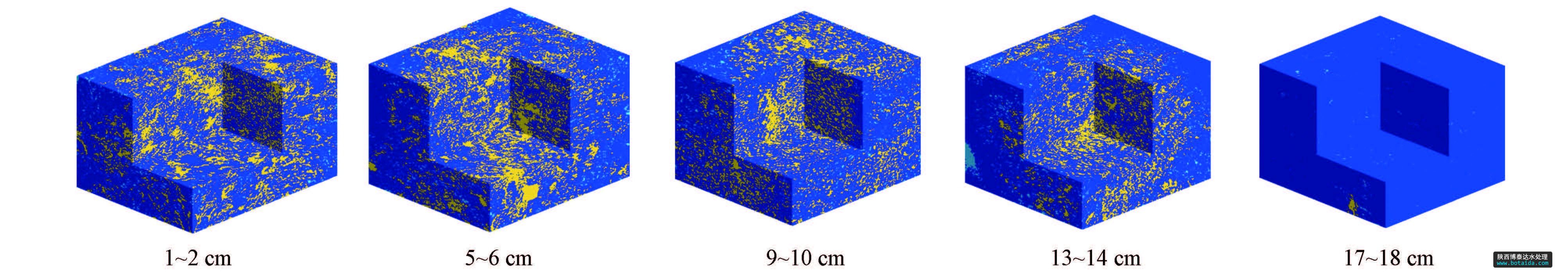 通過Mathematics軟件顯示沉積物各點三維孔隙結(jié)構(gòu),如圖 2所示,圖中深藍(lán)色部分為沉積物基質(zhì),黃色部分為連通孔,淺藍(lán)部分為孤立孔.