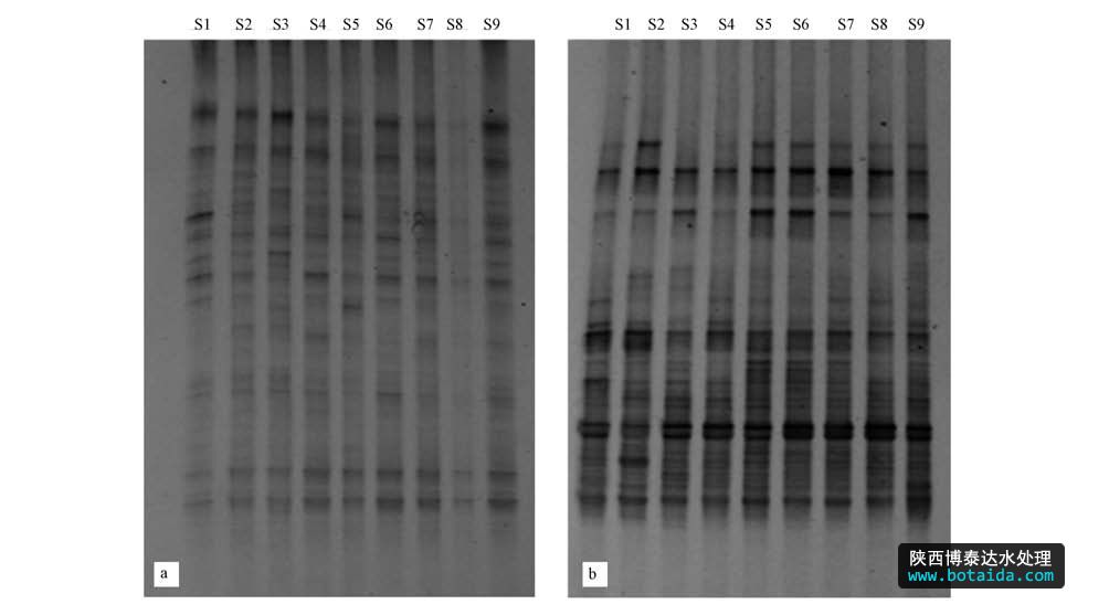 圖2 大亞灣海域浮游細菌16S rDNA V3區(qū)DNA圖譜(a. 2010年冬,b. 2011年夏)