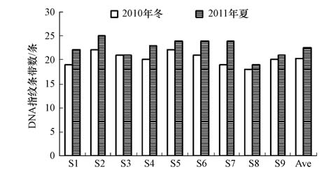 1)大亞灣海域浮游細菌DNA指紋條帶豐富,在2010年冬和2011年夏的調(diào)查中共分別得到32和33條DNA指紋條帶,每個樣品的DNA條帶數(shù)為18~25條.