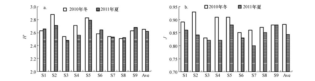 圖5 大亞灣浮游細菌DNA指紋的Shannon-Weaver多樣性指數(shù)(H′)和PieLou均勻度(J)(a. H′,b. J)