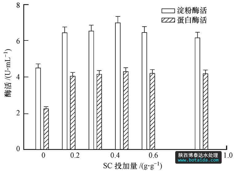 SC對(duì)污泥酶水解影響:設(shè)立2批次實(shí)驗(yàn)(每批次包括6個(gè)實(shí)驗(yàn)組),各批次均取400 mL污泥,分別投加蛋白酶、淀粉酶0.06 g · g-1(以TS 計(jì),下同),SC以粉末形式投加,SC的投加量分別為0、0.144、0.288、0.432、0.576、0.864 g · g-1,隨后向各錐形瓶中通入氮?dú)饧s4 min以完全驅(qū)除殘留空氣,加塞置于50℃水浴振蕩器上反應(yīng),4 h后取樣測(cè)定水解產(chǎn)物及蛋白酶和淀粉酶的活性,并進(jìn)行分析.同時(shí)設(shè)定空白對(duì)照組,除不加酶和SC外,其它條件與實(shí)驗(yàn)組均相同.