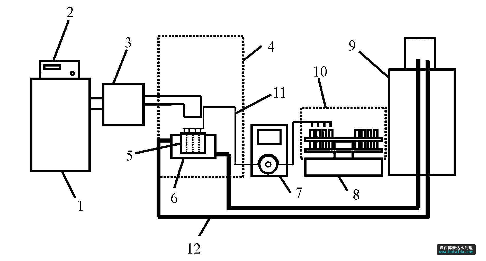 圖1 單線態(tài)氧捕獲裝置示意圖(1.光源,2.光強(qiáng)調(diào)節(jié)器,3.單色儀,4.暗室,5.多通量反應(yīng)杯,6.冷阱,7.恒流泵,8.部分收集器,9.恒溫循環(huán)水,10.遮光罩,11.采樣管路,12冷凝水管路)