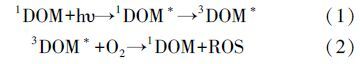 溶解性有機(jī)質(zhì)(DOM)含有發(fā)色基團(tuán),是重要的天然光敏劑,在紫外輻射或太陽光照射下,單線態(tài)(state DOM singlet,1DOM)分子吸收光能先轉(zhuǎn)化為激發(fā)單線態(tài)(excited state DOM singlet,1DOM*),進(jìn)而轉(zhuǎn)化為激發(fā)三線態(tài)(excited state DOM triplets,3DOM*),進(jìn)一步與溶解氧分子發(fā)生一系列反應(yīng),產(chǎn)生活性氧物質(zhì)(reactive oxygen species,ROS),如羥基自由基(hydroxyl radical,· OH)、單線態(tài)氧(singlet oxygen,1O2)、超氧化物(superoxide,O2-)等(見反應(yīng)式(1)、(2.這些活性氧物質(zhì)可以誘導(dǎo)有機(jī)污染物光降解,同時(shí),DOM也會(huì)與目標(biāo)化合物競(jìng)爭光吸收,或猝滅目標(biāo)化合物的激發(fā)態(tài),DOM對(duì)有機(jī)污染物的光解具有光敏化和光屏蔽雙重作用(Chen et al., 2009;,這與DOM的來源、組成、化學(xué)結(jié)構(gòu)等特點(diǎn)密切相關(guān).因此,溶解性有機(jī)質(zhì)在水生生態(tài)系統(tǒng)光化學(xué)中扮演重要角色,可以影響有機(jī)污染物的環(huán)境行為和生態(tài)風(fēng)險(xiǎn).