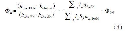 式中,Iλ表示光源在每個(gè)波長下的光照強(qiáng)度(W · m-2);aλ,DOM和aλ,PN分別表示腐殖酸和光敏劑在每個(gè)波長處的納氏吸收系數(shù)(m-1),可由公式(5)計(jì)算得到;Sλ是屏蔽因子,無量綱,可由公式(6)計(jì)算得到.