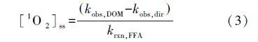 一般采用單線態(tài)氧平衡濃度(singlet oxygen steady-state concentrations,[1O2]ss)對(duì)腐殖酸產(chǎn)生1O2的產(chǎn)量進(jìn)行表征.FFA作為對(duì)1O2的捕獲劑,其降解的快慢可以反映產(chǎn)生1O2的速率.[1O2]ss可由FFA降解速率常數(shù)kobs,DOM和FFA自身光降解速率常數(shù)kobs,dir經(jīng)公式(3)計(jì)算得到.