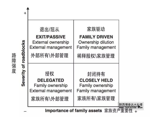 家族企業(yè)路線圖為家族可以選擇的路線提供了一個非常簡明的圖解。通常,它能做出如下預測:家族資產(chǎn)漸趨減少的企業(yè)應(yīng)該更多地尋求外部管理的介入,而目前以及未來面臨重大障礙的企業(yè),則應(yīng)該積極尋求所有權(quán)結(jié)構(gòu)的改革,以便將障礙可能造成的損失減小到最低。